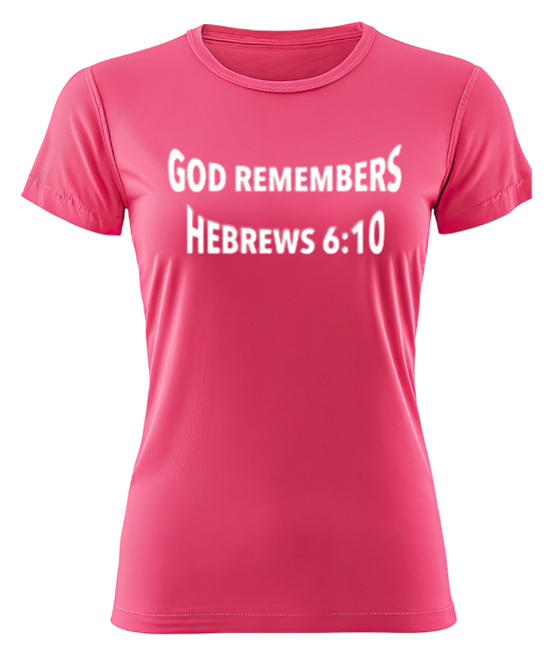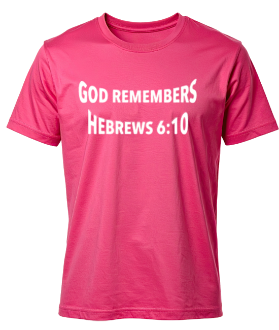 Pink unisex T-shirt with God Remembers Hebrews message in white color available in S, M, L, XL, 2XL, 3XL sizes
